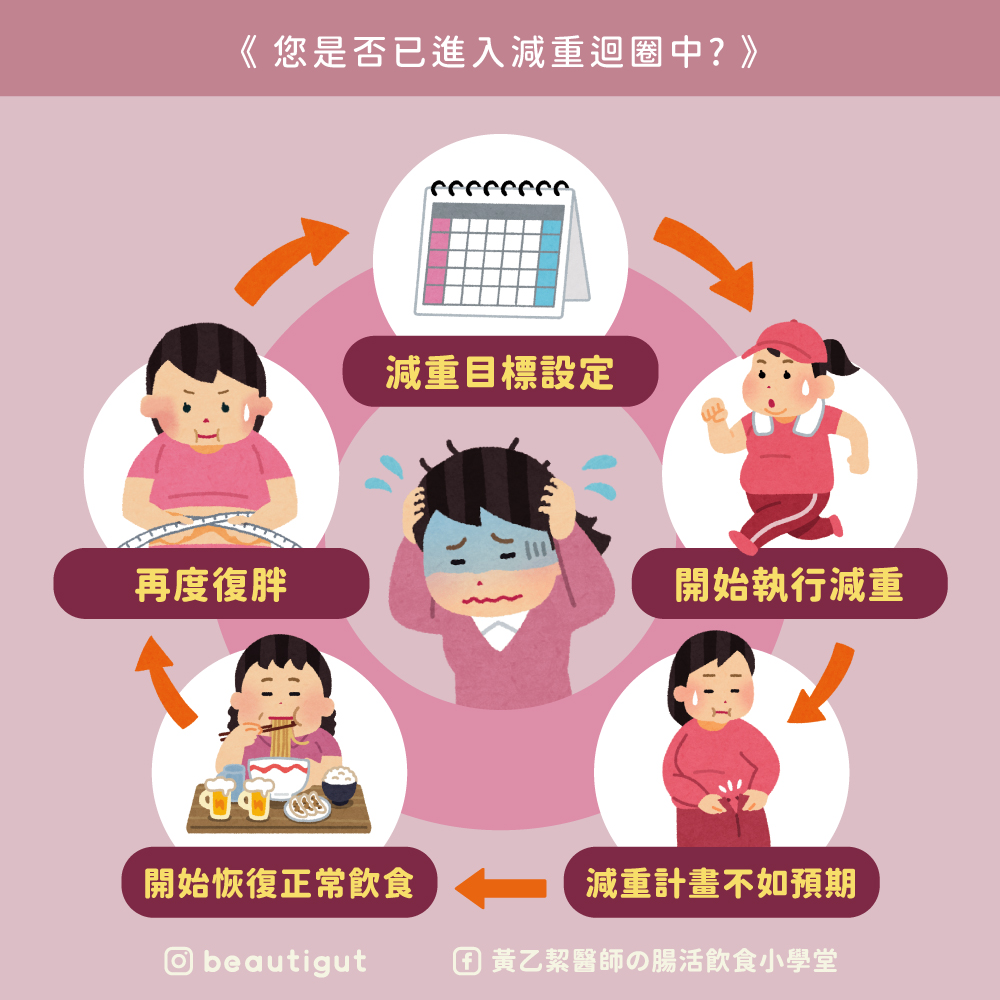 我在臨床上最常看到患者長期處在減重迴圈當中,最後抱著試試看的心態來找我,我想應該大家都一樣會把「理想體重」「目標體重」設定為最終目標,一開始減重很有信心,時間一久體重停滯的時候,就開始鬆懈,再來就是直接放棄,當然就會「復胖」,您有沒有算算看您這幾年當中到底減重了幾次呢?是不是瘦了又胖、瘦了又胖、瘦了又胖呢?