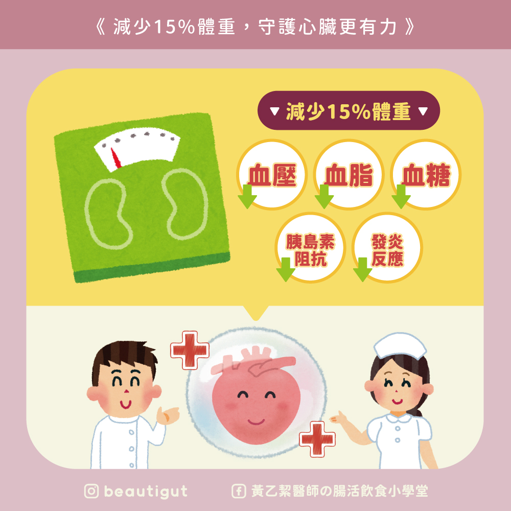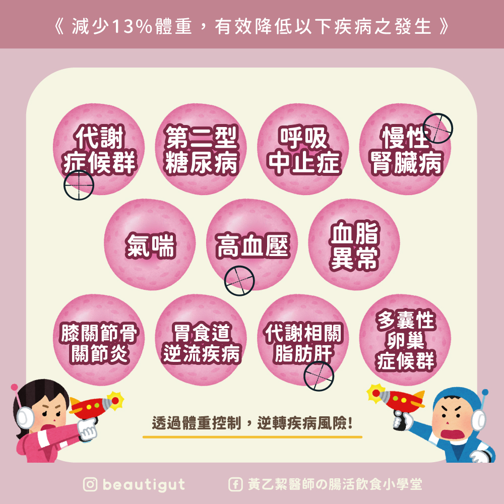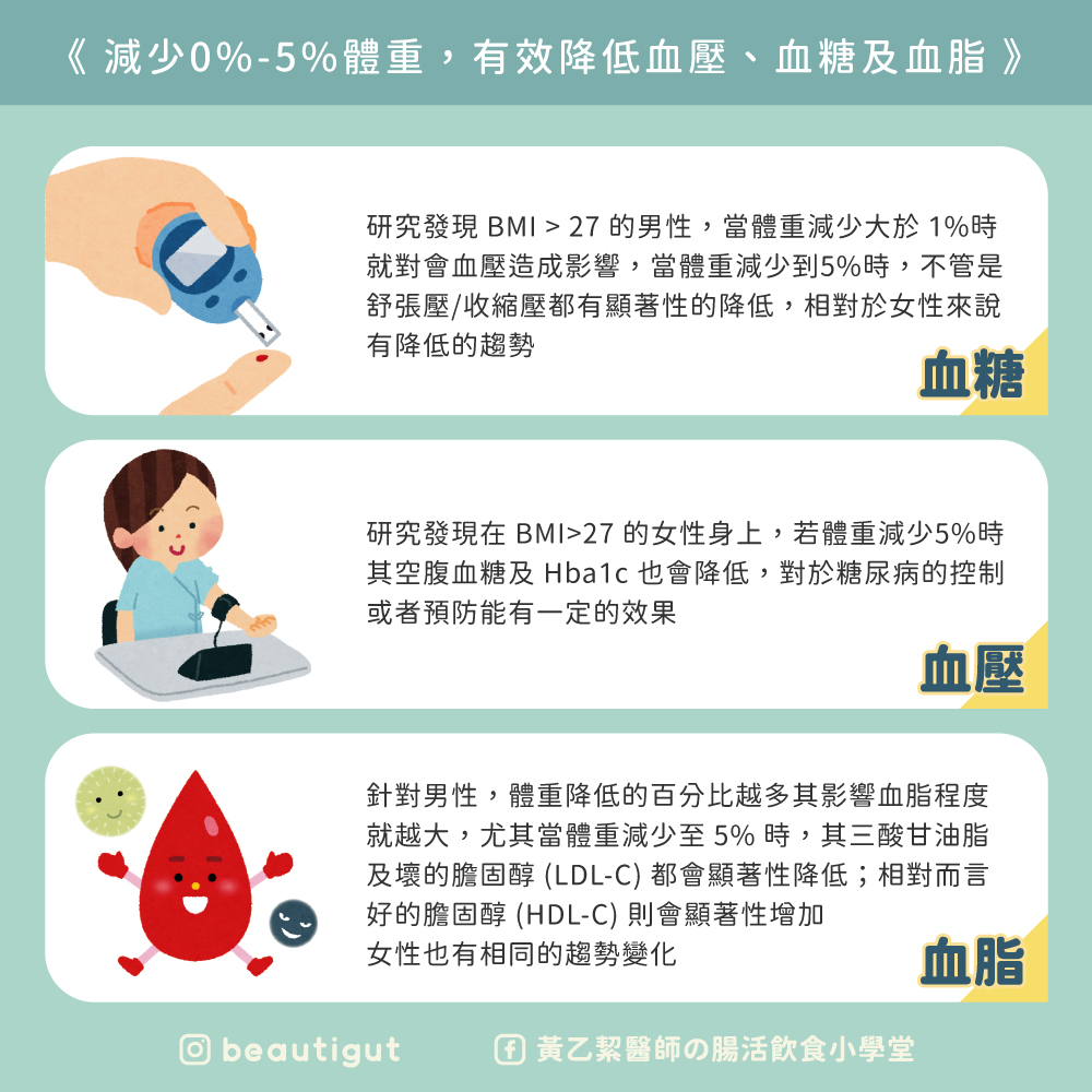 透過2019年日本的研究發現,在收集2579名健康的男女性,其BMI皆大於25且無任何慢性疾病的人群,來研究不同比例體重的減少對於血壓、血脂及血糖之影響。結果發現,雖然體重減少的百分比僅有5%,但對於相關慢性病的預防及相關血液生化值都能達到一定的影響力。慢性病不是一天所造成的,肥胖是一個重要的危險因子,許多人都會認為只要還沒達到疾病診斷標準就沒有關係,一旦罹患疾病時,身體許多調節器也開始失衡,這時候就只能積極的控制與藥物治療了。