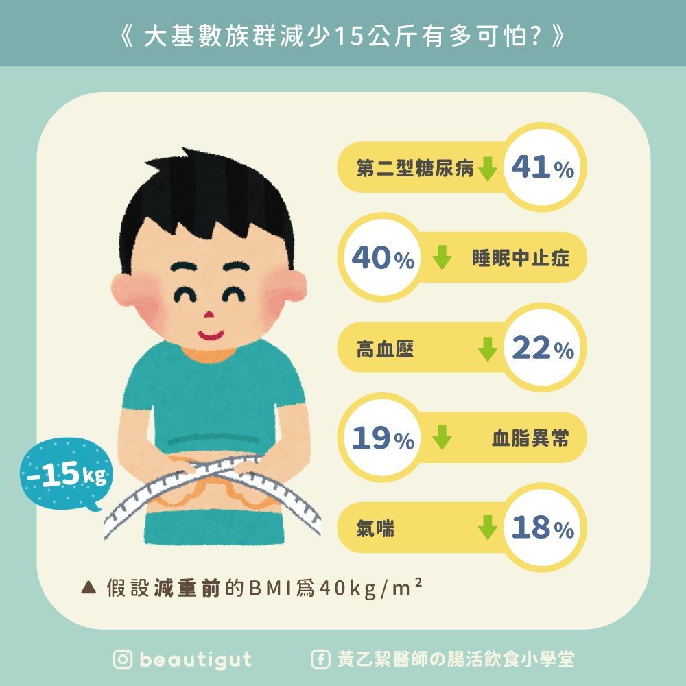 2021由英國學者將臨床研究資料庫 (Clinical Practice Research Datalink GLOD database) 進行回溯性研究,結果發現BMI平均為35.3的族群其相關慢性病的風險皆會高於BMI平均為30的族群,接著把BMI劃分成三個族群為30.5-35、34.8-40.0及39.2-45.0,結果顯示三個組別在減輕13%的體重後,皆能降低第二型糖尿病、慢性腎臟病、高血壓及血脂代謝異常的風險,尤其是在BMI>40的人群上影響力更大。所以即使BMI很高,只要減少13%的體重就能有效降低與肥胖相關慢性病的風險,其相關疾病如下: